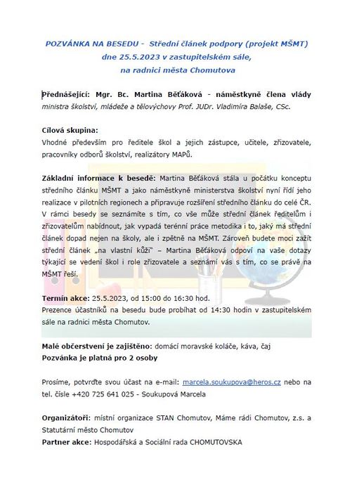 Srdečně Vás zveme na besedu – Střední článek podpory (projekt MŠMT), jejímž partnerem je Hospodářská a sociální rada Chomutovska.
