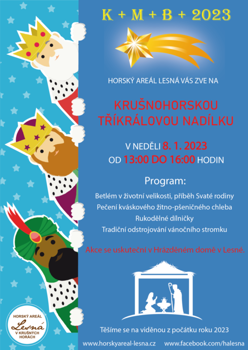Horský areál Lesná Vás zve na KRUŠNOHORSKOU TŘÍKRÁLOVOU NADÍLKU v neděli 8.1.2023 od 13 do 16 hod. Akce se uskuteční v Hrázděném domě v Lesné.