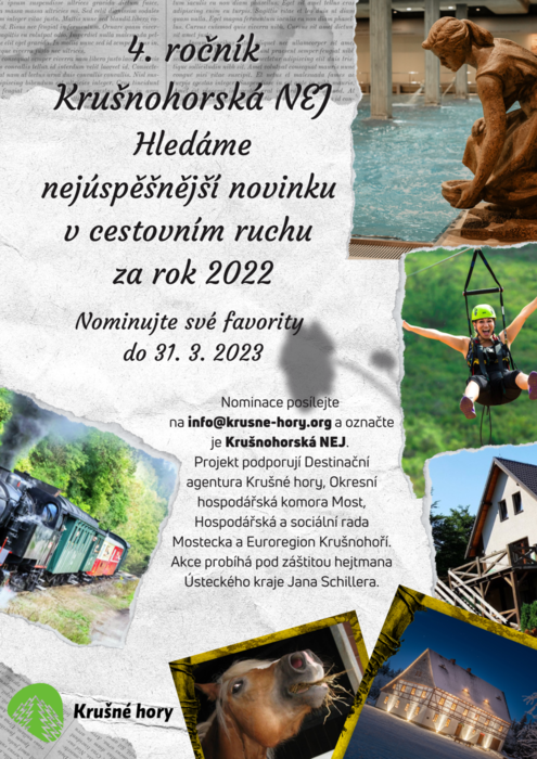 Turisté nejen z Ústeckého kraje mohou nominovat do soutěže tu novinku, která je v roce 2022 nejvíce oslovila. „Může to být akce, zážitek, nově otevřená restaurace, ubytování nebo třeba propagační materiál, nový časopis o cestování, aplikace, webové stránky, prostě cokoliv, co podporuje cestovní ruch v regionu. Podmínkou je, aby se jednalo o novinku z oblasti Chomutovska, Mostecka, Litvínovska, Bílinska, Teplicka a horské části Krušných hor,“ vysvětluje ředitelka Destinační agentury Krušné hory Petra Fryčková. Na nominaci svého favorita má každý čas do 31. března. Všechny nominované produkty zveřejní SPO-NA na svých sociálních sítích a seznámí s nimi veřejnost i prostřednictvím informačních kanálů svých partnerů. Z nominovaných produktů vybere vítěze veřejnost při hlasování na sociálních sítích. Nominace posílejte na info@krusne-hory.org a označte je Krušnohorská NEJ. Vítězem loňského třetího ročníku se stal Selský dvůr Braňany. Nad akcí převzal záštitu hejtman Ústeckého kraje Jan Schiller.