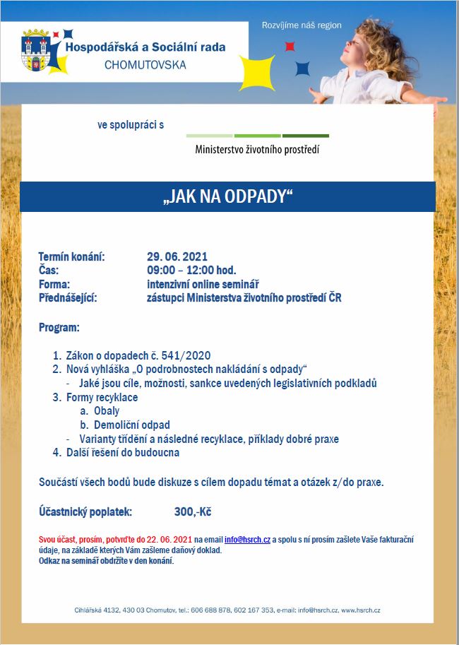 Prostřednictvím online semináře „Jak na odpady“ vám chceme pomoci získat odpovědi na vaše otázky od těch, kteří zákon tvořili a mohou vám osvětlit vše, co vás v této problematice tíží.